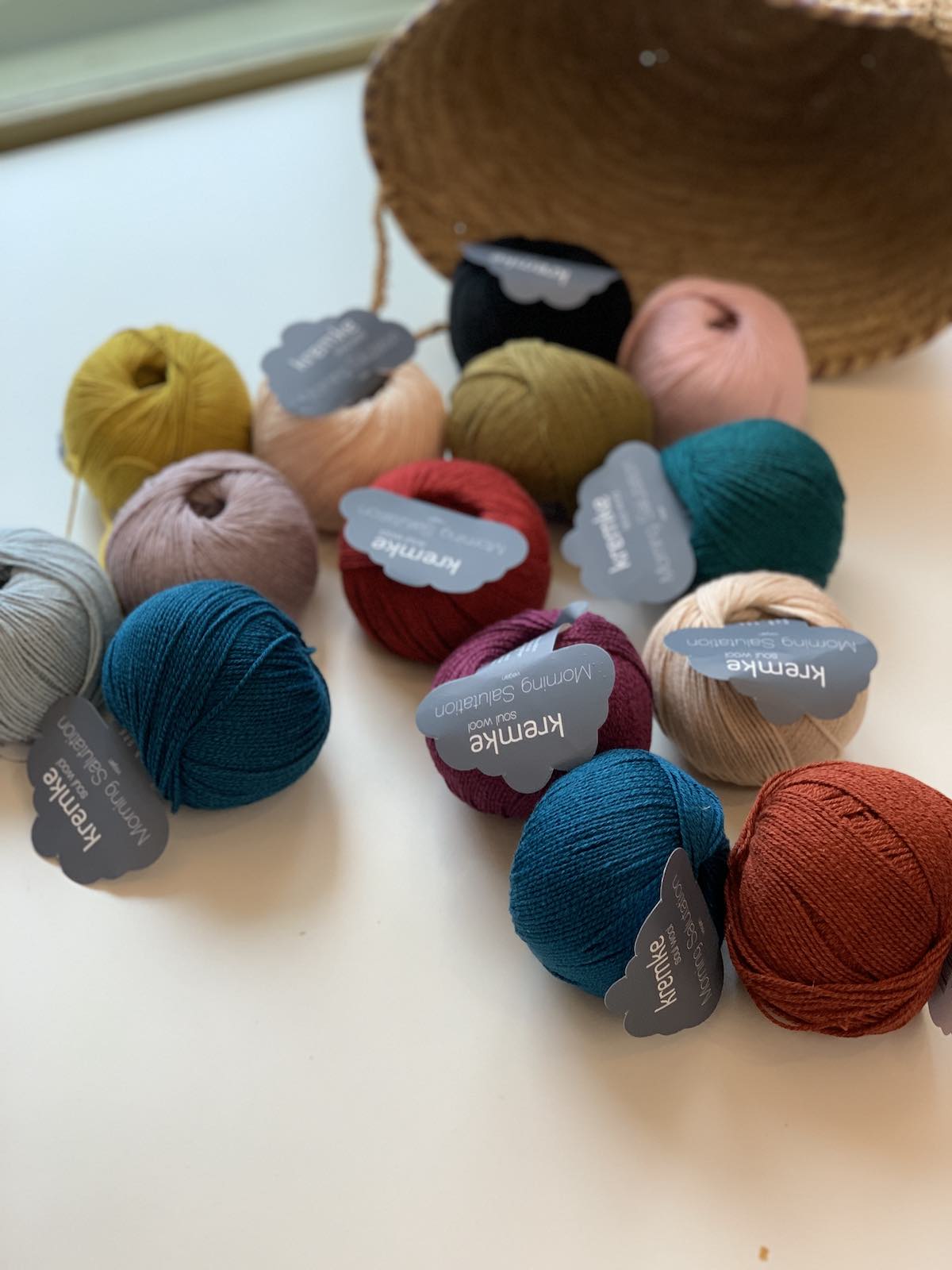 Tiina knitted her Anker Summer Shirt (pictured below) from MORNING SALUTATION VEGAN, which is a cotton-viscose blend by Kremke Soul Wool. It is a tightly spun yarn with subtle sheen. Tiina’s L-size shirt took 7 balls of color Brass.