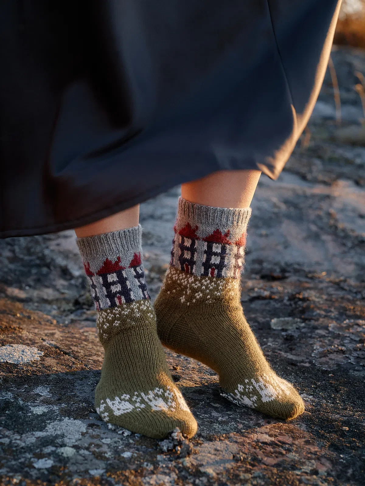 Wool socks are always necessary in the unpredictable seasons in Finland. Knit colorful little cottage colorwork pattern socks for yourself or as a gift, or prepare to knit woolen socks for the whole family for autumn.