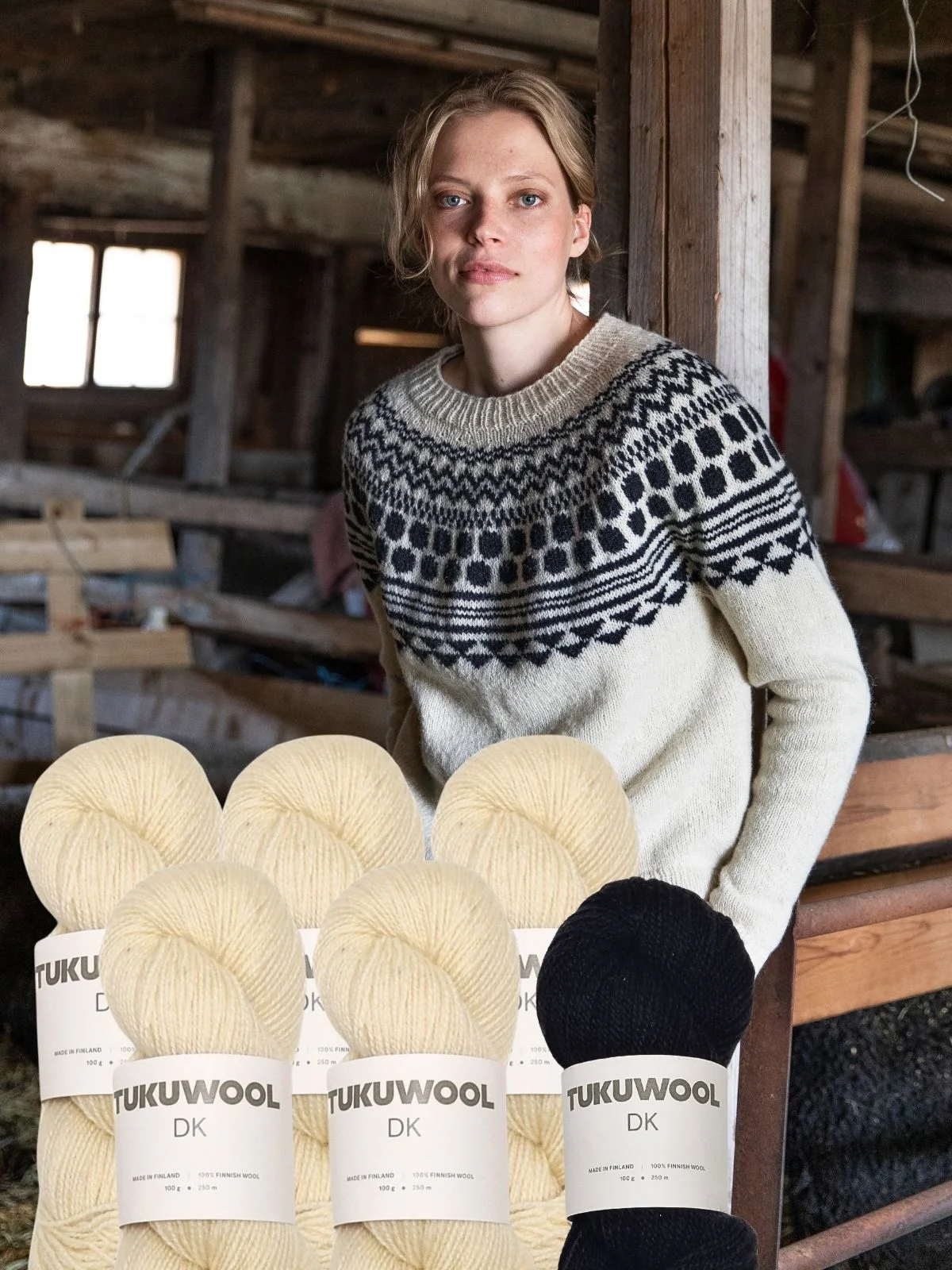 This special edition kit (up to size 8) includes 500 g of white wool and 100 g of black wool in Tukuwool DK – 100% Finnish wool, sustainably produced and beautifully rustic in texture.