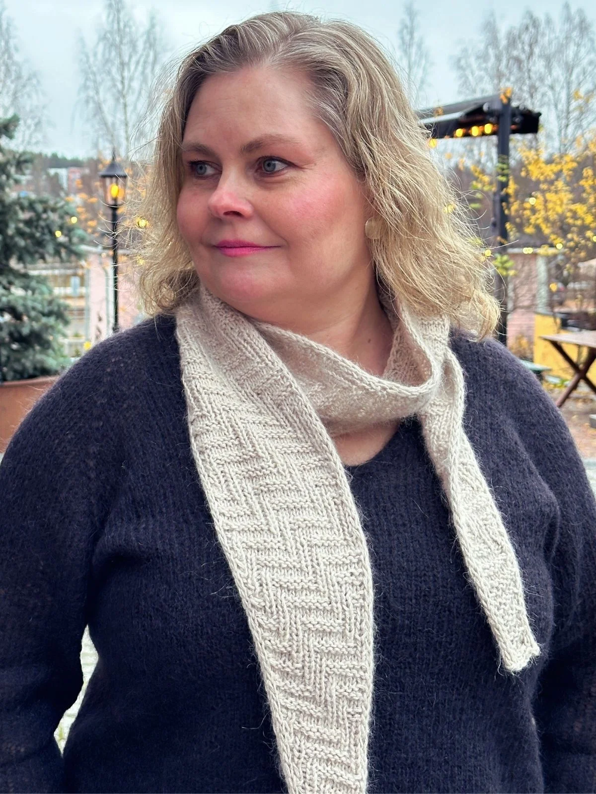 Small Moments, “Hetkinen” in Finnish, is a small simple rectangular shawl with diagonal triangles at both the beginning and the end. The design plays with texture. The combination of cashmere silk and silk mohair creates a soft, lively, and warm fabric.