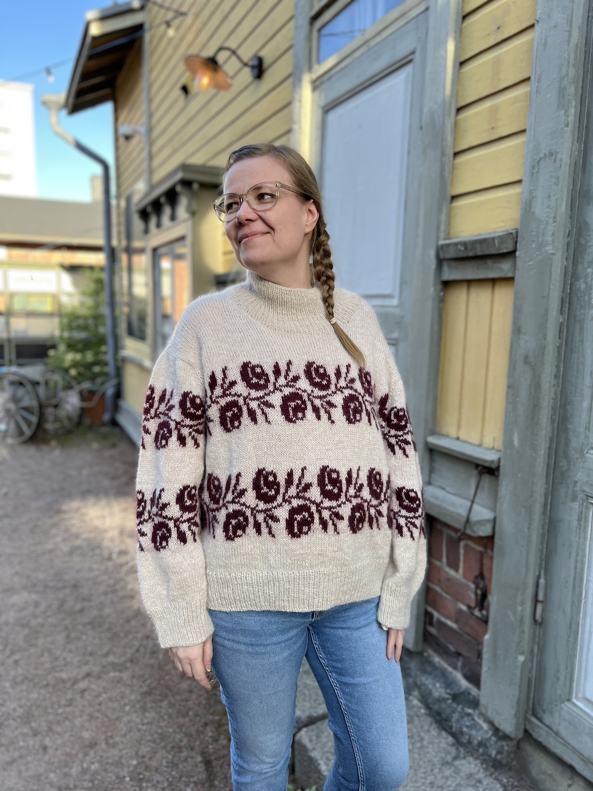 Ruusupusero, jossa on ripaus vintage-tunnelmaa! Rosie Sweater eroaa kaarrokeversiosta rakenteeltaan ja tunnelmaltaan: siinä on pehmeän romanttinen olkalinja ja toistuvat ruusukuvioiset raidat. Kevyt lankayhdistelmä tekee puserosta laskeutuvan ja sopivan myös sisäkäyttöön.