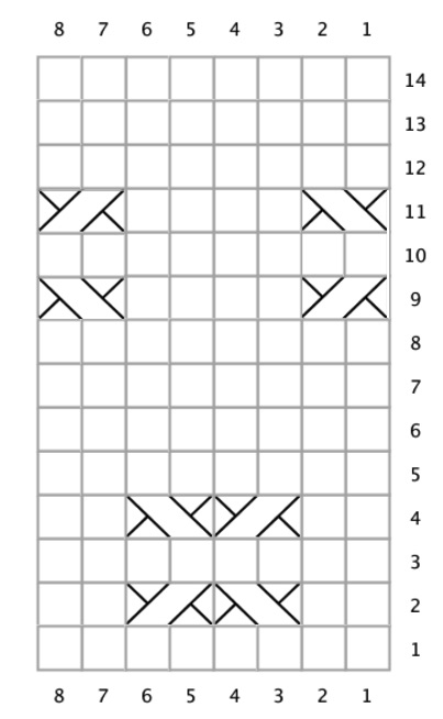 2/2 VP = vasemmalle kääntyvä palmikko: Siirrä 2 s apu- tai palmikkopuikolle, pidä työn edessä. Neulo 2 o, neulo 2 o apu- tai palmikkopuikolta