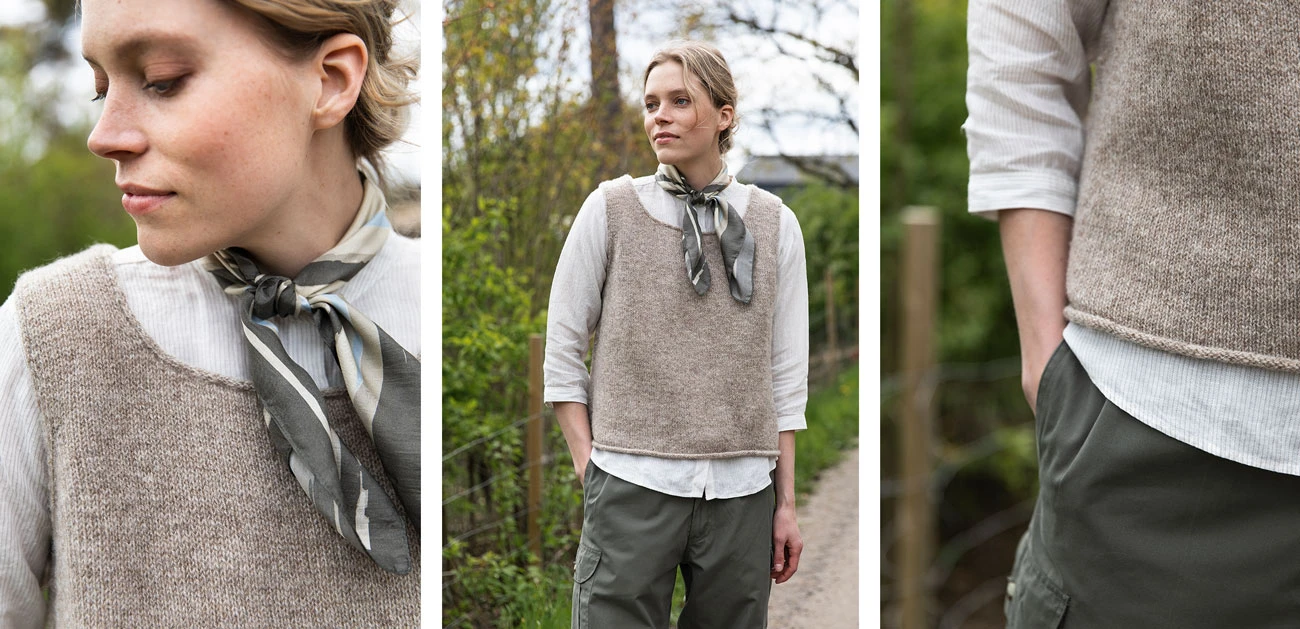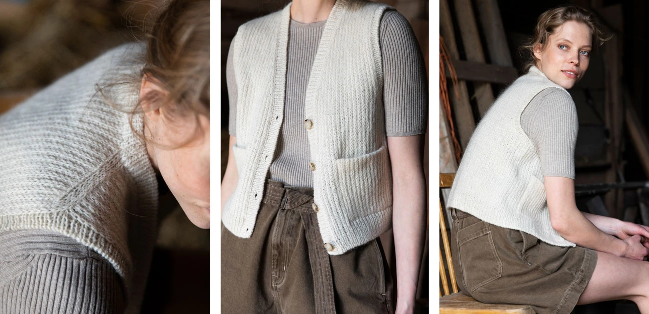 Amanda on klassinen liivi, jossa on käytännölliset taskut ja viimeistelty ilme pienimpiäkin yksityiskohtia myöten. Täydellinen kerrospukeutumiseen neuleen tai paidan päälle – monikäyttöinen lisä jokaiseen vaatekaappiin. Kaksi lankaa – ohut fingering-vahvuinen villa ja pitsivahvuinen silkki-mohair – yhdessä luovat rikasta, tekstuurista pintaa.