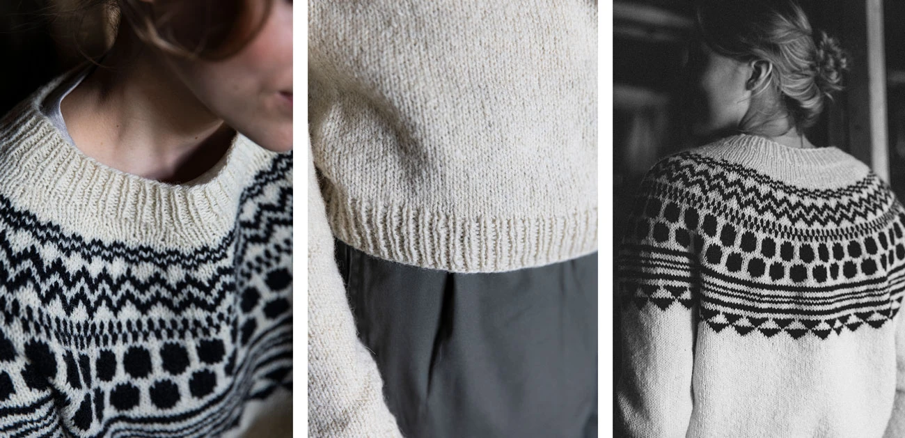 Tämä väljästi istuva pusero on malliltaan unisex, ja ohjeessa on mukana kymmenen kokoa aikuisille. Kaamoksen jujuna on pyöreä kirjoneulekaarroke, jonka kuvio tuo mieleen talvisen hiljaisuuden, tähtitaivaan tai pakkasen huurtamat ikkunat. Värimaailma viimeistelee tunnelman.