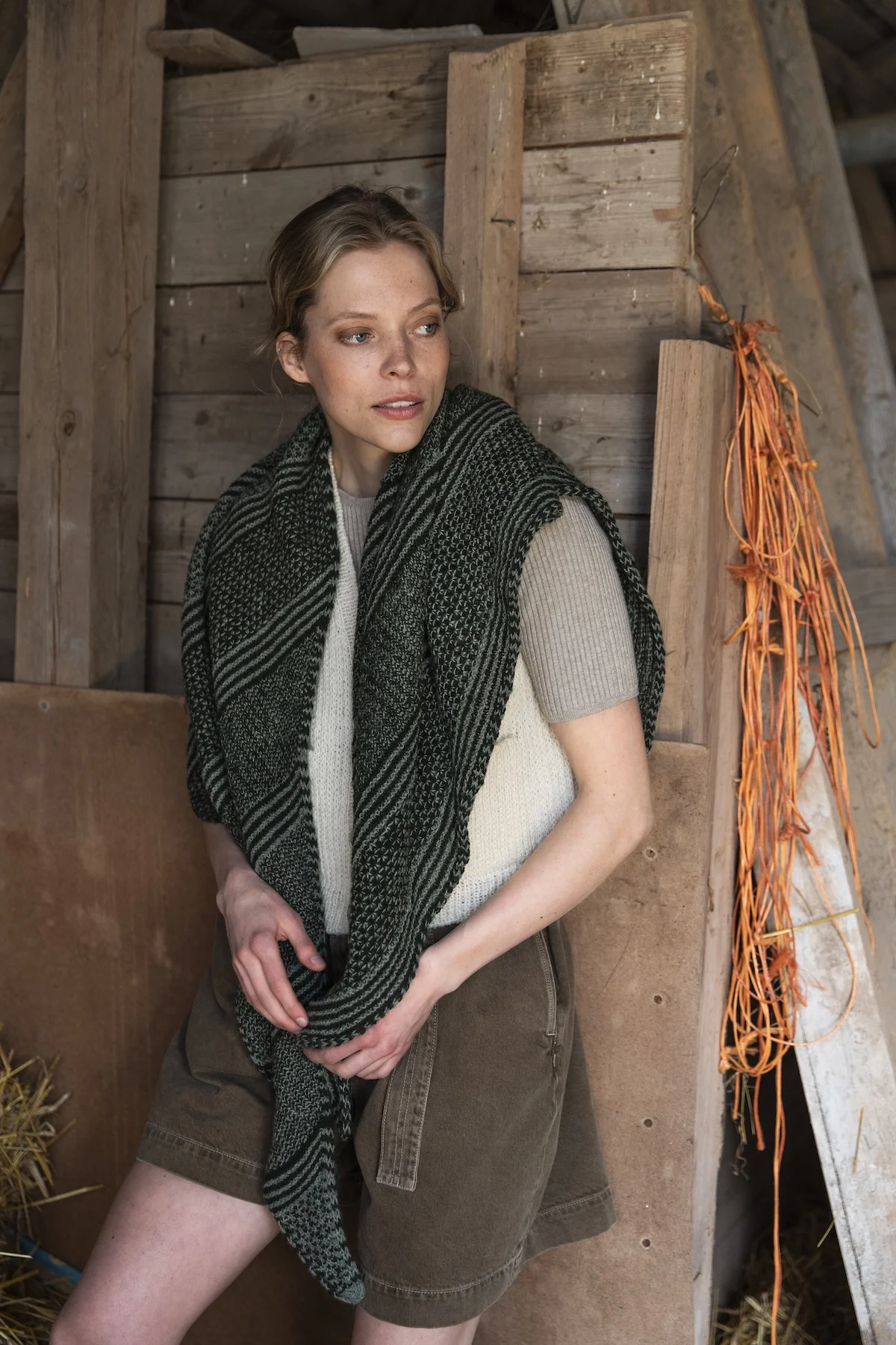 Havina plays with garter stitch stripes and simple, textured stitch patterns. This shawl that comes in three different sizes can be draped over the shoulders, wrapped around the neck, or worn as a light cape. Shifting colors and motifs create a gently undulating surface — like a breeze captured in fabric.