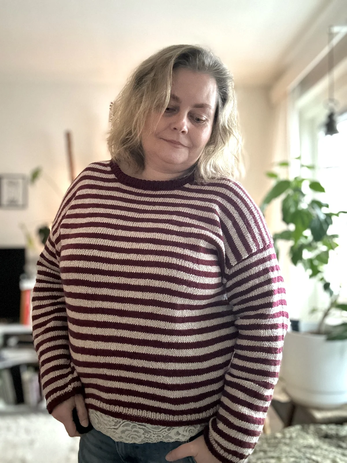 Tiinan neuloma puna-valkoinen raitavillapaita on tehty väreillä Bordeaux ja Light Beige. Petiteknit Metten mallineuleen värit ovat tumma sininen ja valkoinen, kuten Tukuwool lankojen Navy ja Natural White.