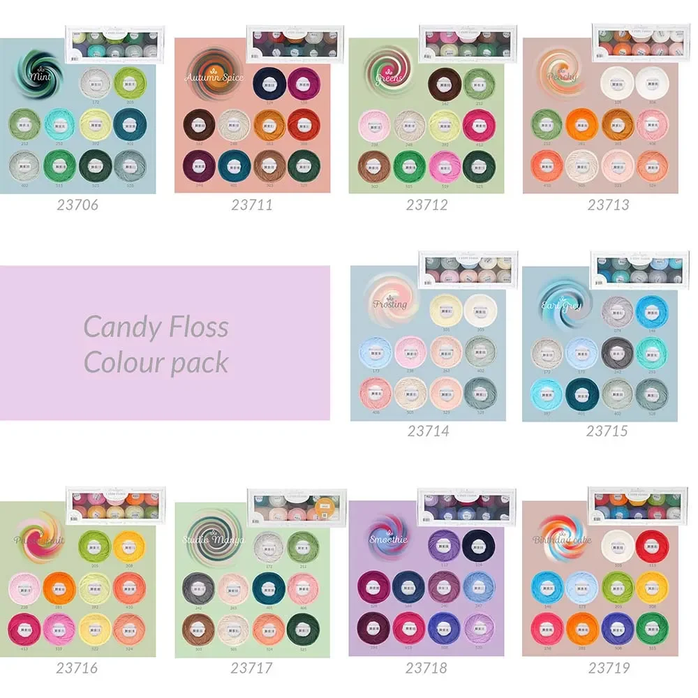 Candy Floss -lankaa on paketteina, joissa 10 kpl eri värejä. Langan vahvuus on nro 10, ja suositeltu koukku- tai puikkokoko on 0,75–1,25 mm. Lanka on konepestävä 40 °C:ssa.