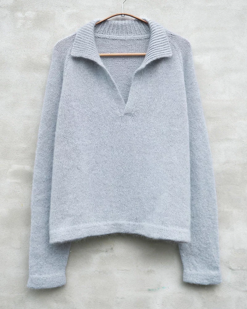 Wilson Sweater is a simple sweater with an open polo collar. It is worked from the top down using 1 strand of Merino + 1 strand of Soft Silk Mohair held together throughout.